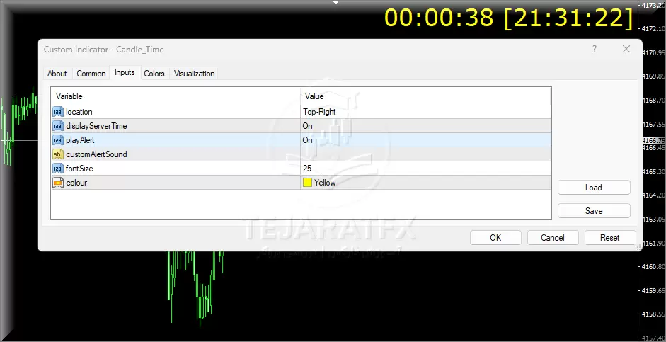 تصویر زیر بخش تنظیمات داخلی اندیکاتور کندل تایم در متاتریدر 4 هست که توضیحات در ویدئوی ابتدای مقاله هست.