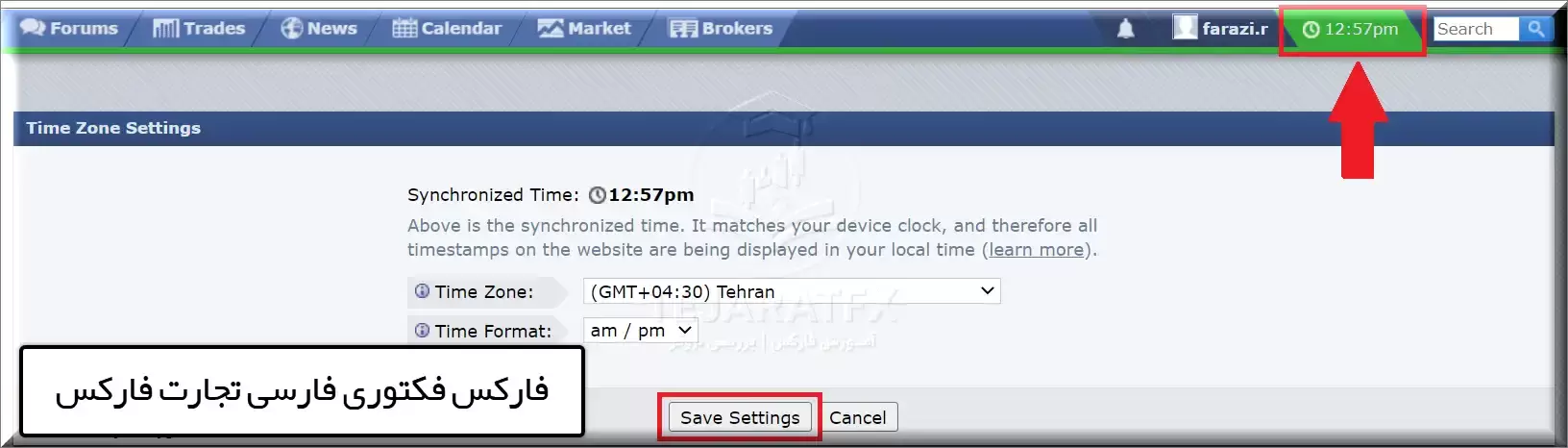 اگر پست رو مطالعه بفرمایید یک بخش مجزا بصورت تصویری گفته شده که بعنوان مثال در سایت فارکس فکتوری چطور ساعت رو به وقت تهران میشه تنظیم کرد.