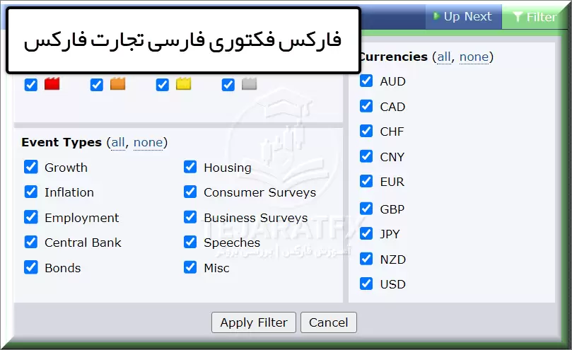 یکی از بخشهای کاربردی این تقویم انگلیسی فارکس فکتوری بخش فیلترها هست که توی عکس بالا با فلش در سمپ راست مشخص کردیم و با کلیک روی آن با فضایی مشابه تصویر زیر مواجه خواهید شد.