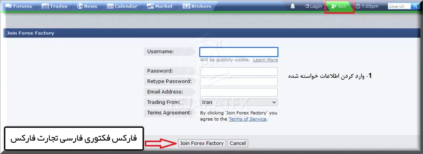 برای ثبت نام در فارکس فکتوری و ورد به این سایت مطابق تصویر بالا روی دکمه جوین کلیک کنید تا وارد صفحه ای مشابه عکس زیر بشین.