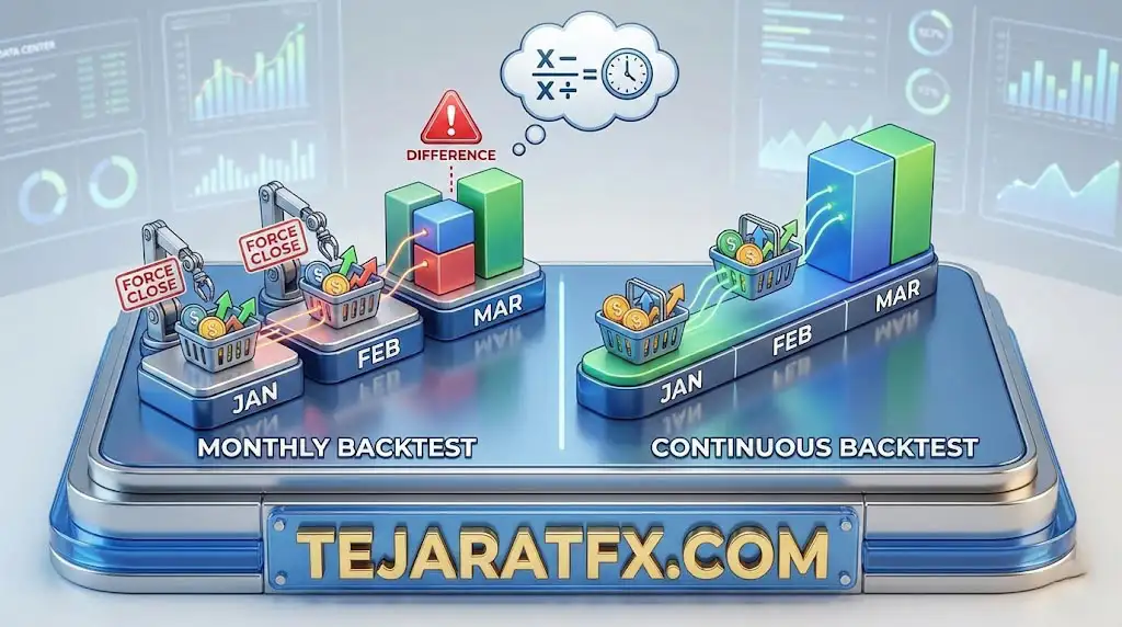 جواب بسیار ساده است. اگر دقت کنید در بکتست های ماهیانه در پایان هر ماه بدون در نظر گرفتن نتیجه آخرین پوزیشنها از آنها خارج شده تا نتایج را بتواند ثبت کند ولی در بکتست یکجا، ما همچین موردی را نداریم. یقینا نتیجه همان معاملات باز نیز در برآیند تاثیر خواهد داشت و البته در باز شدن بسکت جدید نیز متفاوت خواهد بود. چرا که تا یک بستک به نتیجه ای نرسد اکسپرت بسکت جدید را شروع نخواهد کرد.
